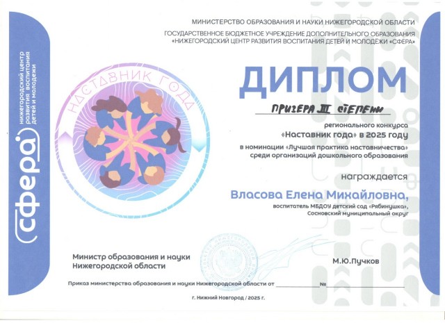 Диплом призера III степени регионального конкурса "Наставник года" в 2025 году в номинации "Лучшая практика наставничества" среди организаций дошкольного образования, 2025г. |