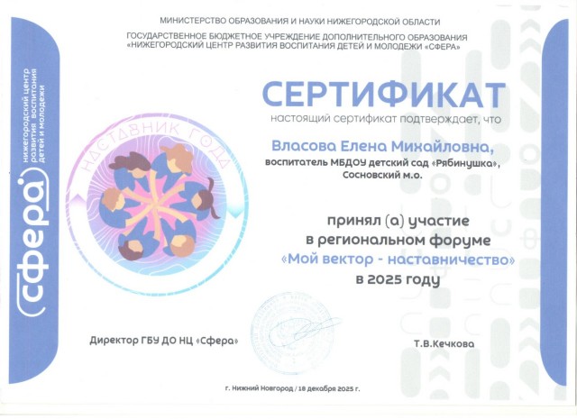 Сертификат об участии в региональном форуме "Мой вектор - наставничество" в 2025 году, г. Нижний Новгород, 18 декабря 2025г. |