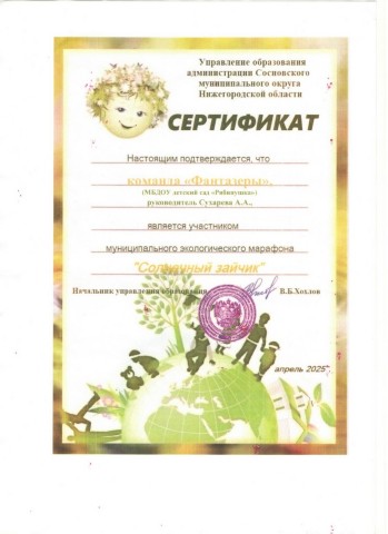 Сертификат участника муниципального экологического марафона "Солнечный зайчик". Команда "Фантазеры". Руководитель Сухарева А.А., Управление образования администрации Сосновского мунициального округа Нижегородской области, апрель 2025г.