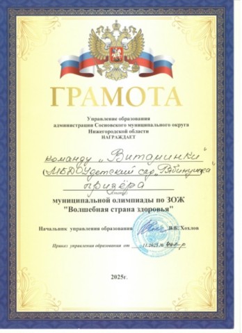 Грамота призера (3 место) команды "Голубые береты" в муниципальном этапе областных соревнований "Нижегородская Зарничка 2.0"