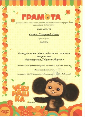 Грамота призера Конкурса новогодних поделок семейного творчества "Мастерская Дедушки Мороза". Номнация "Лучшая авторская новогодняя игрушка по тмем "Планета Эрмитажа", 2025г.
