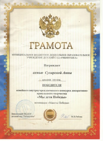 Грамота победителя семейного внутриучрежденческого конкурса декоративно-прикладного творчества "Мы дети Победы". номинация "Макеты Победы", 2025г.
