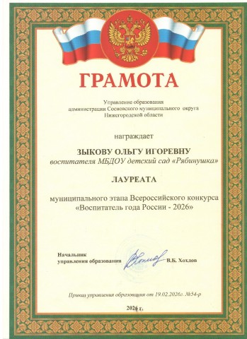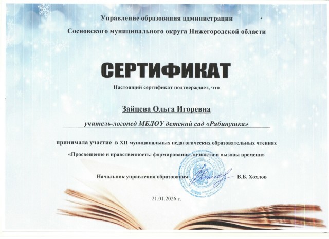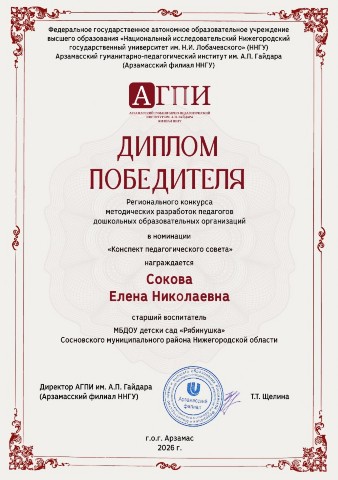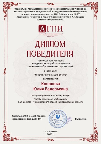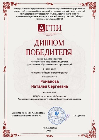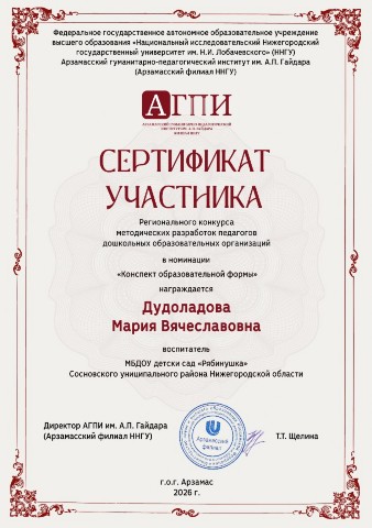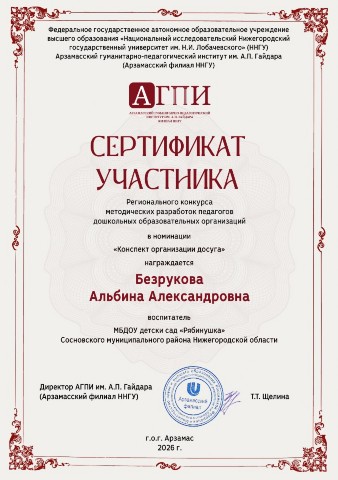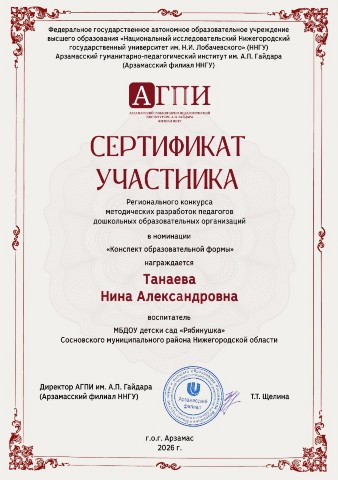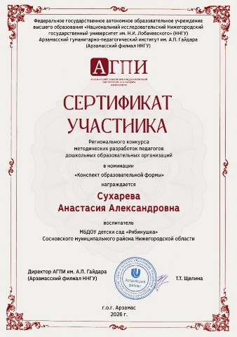 Сертификат участники Регионального конкурса методических разработок педагогов дошкольных образовательных организаций. Номинация "Конспект оразовательной формы", Арзамасский гуманитарно-педагогический институт им. А.П. Гайдара филиал ННГУ, 2026г.